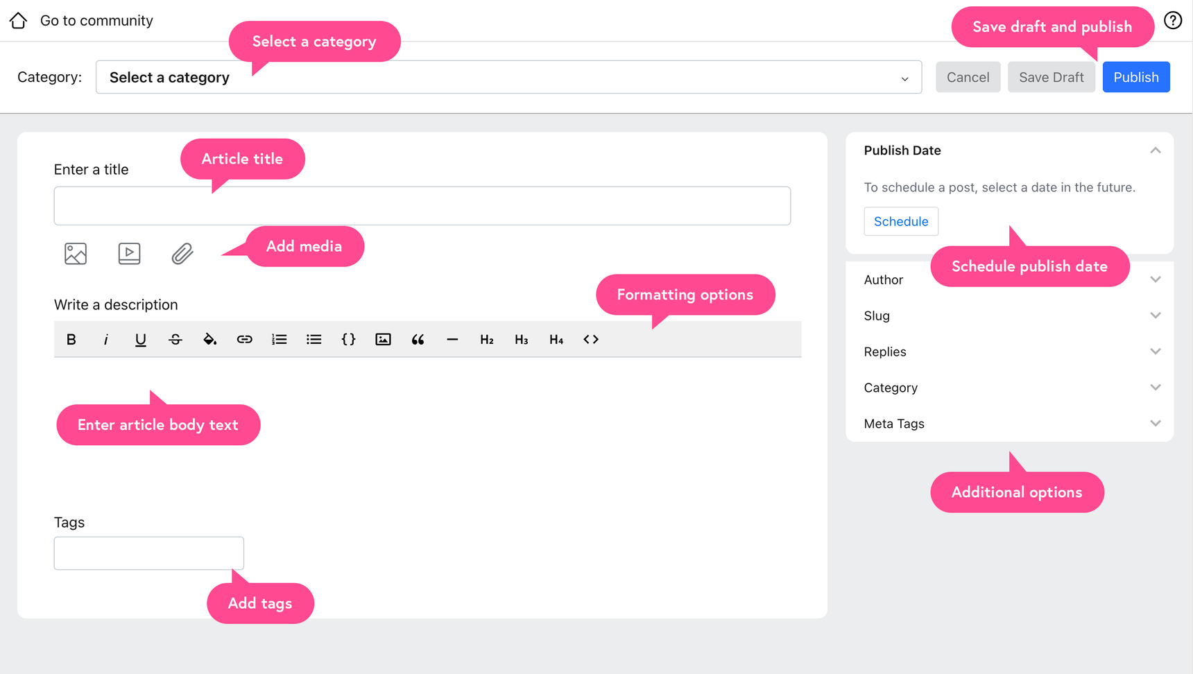 This article describes how to add and edit articles in your community or help center. While we cover articles specifically here, these steps also apply for any type of topic including discussions, questions and ideas.