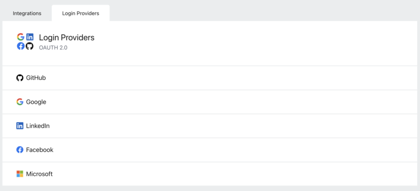 Enable login provider integrations: Google, LinkedIn, GitHub, and Facebook