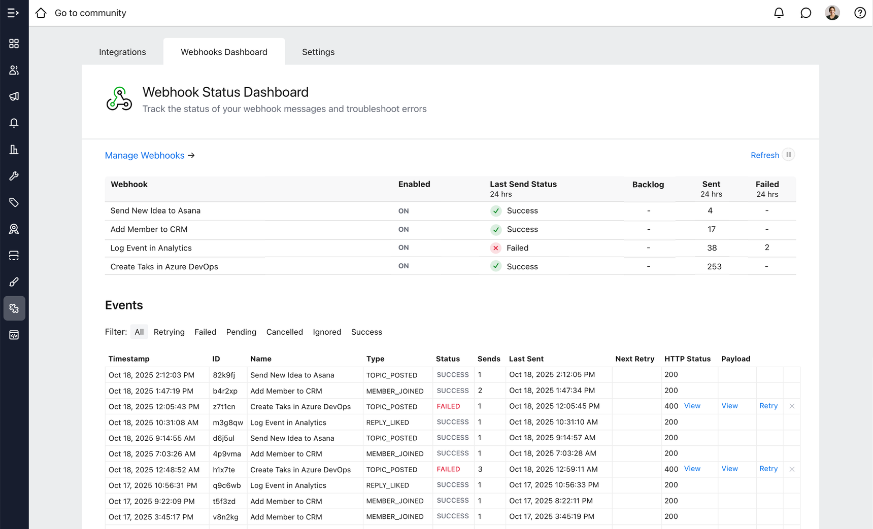 The Webhook Status Dashboard gives you real-time visibility into your webhook activity, helping you ensure data flows smoothly between Forumbee and your external systems. Use it regularly to monitor performance, troubleshoot issues, and keep your community’s integrations running at peak reliability.