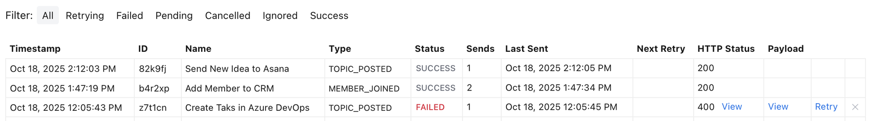 - HTTP Status: The response code from the receiving endpoint (e.g., 200 OK or 400 Bad Request) with a link to view the full response message.