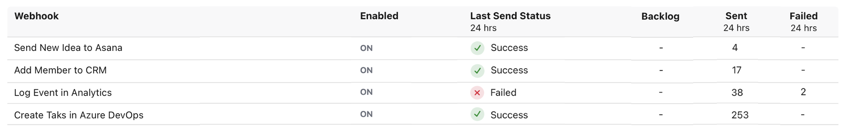 - Sent (24 hrs): The number of webhooks successfully sent in the last 24 hours.